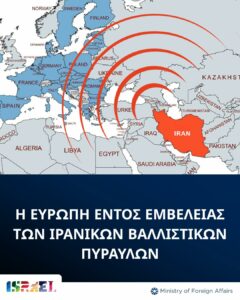 Σε ανάρτησή της χθες Δευτέρα 2 Μαρτίου, η Πρεσβεία του Ισραήλ στην Ελλάδα προειδοποιούσε την Ευρώπη με γράφημά της σύμφωνα με το οποίο πολλές ευρωπαϊκές χώρες, μεταξύ τους και η Ελλάδα, βρίσκεται εντός της εμβέλειας των βαλλιστικών πυραύλων του Ιράν.