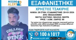 Ειδικότερα, στις 28 Μαρτίου 2026, εξαφανίστηκε από τη Θεσσαλονίκη, ο Χρήστος Τσακίρης, 28 ετών. Το «Χαμόγελο του Παιδιού» ενημερώθηκε για την εξαφάνιση του σήμερα στις 02/4/2026 και προχώρησε, κατόπιν αιτήματος της οικογένειάς του, στη δημοσιοποίηση των στοιχείων του, καθώς ενδέχεται να συντρέχουν λόγοι, οι οποίοι θέτουν τη ζωή του σε κίνδυνο.